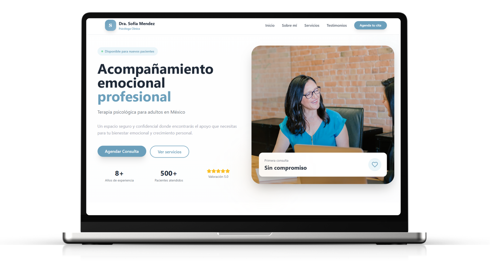 Muchos profesionistas tienen excelente preparación, pero su presencia digital no facilita el primer contacto. Una web clara ayuda a explicar tus servicios, ordenar la información y guiar a las personas correctas a contactarte.